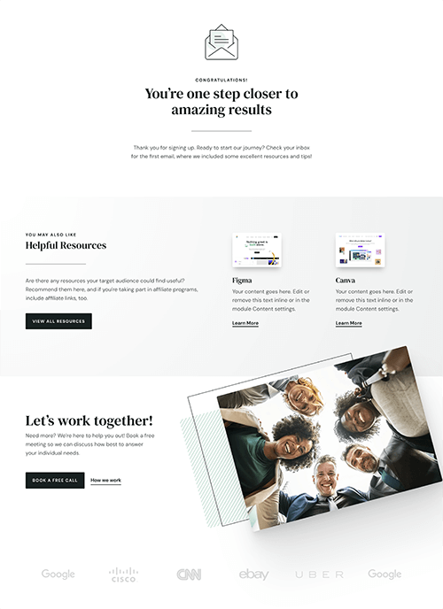 Pick and choose from prestyled sections and modules included with Milly child theme elements to easily create the pages your website needs – or let yourself be effortlessly guided by expert marketing prompts, available right inside Milly.